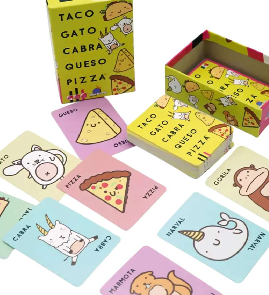 Taco, Gato, Cabra, Queso, Pizza es un juego de cartas donde las palabras y las imágenes crean un caos divertidísimo.