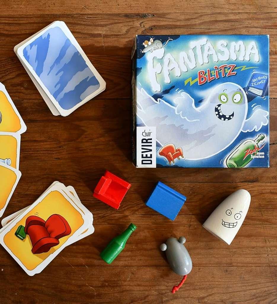 En Fantasma Blitz, la mesa se convierte en un campo de batalla de reflejos ⚡👀. Cinco objetos —un fantasma blanco, una botella verde, un sillón rojo, un libro azul 📚 y un ratón gris 🐭— esperan en el centro.