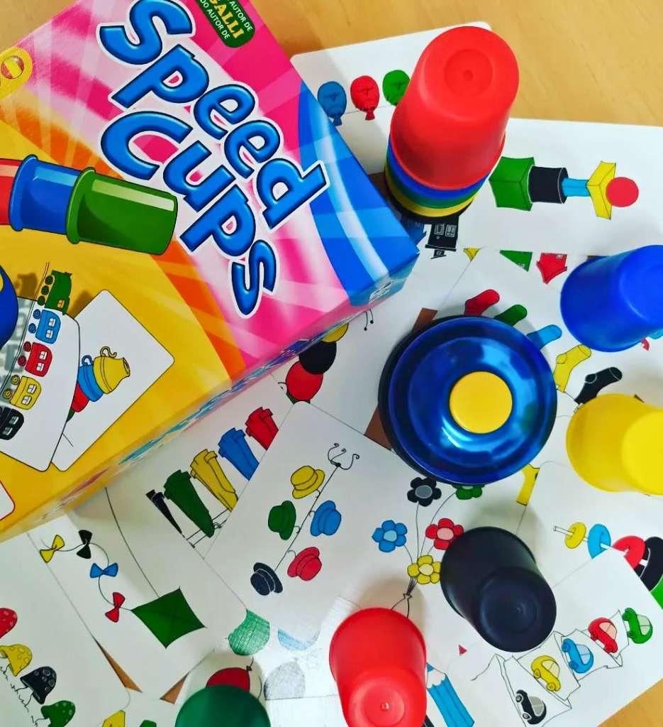 Speed Cups es un trepidante juego de reflejos en el que todos los jugadores compiten al mismo tiempo 🏁. Una carta muestra una combinación de colores y formas que deben replicar lo más rápido posible con cinco cubos. Pero atención: ¡a veces van en fila, a veces en columna! 😵💫